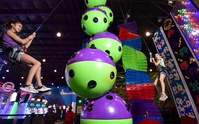Challenge yourself to the 30', 3 stories high Sky Trail® ropes course! Features dozens of individual climbing elements including a Zip Line!